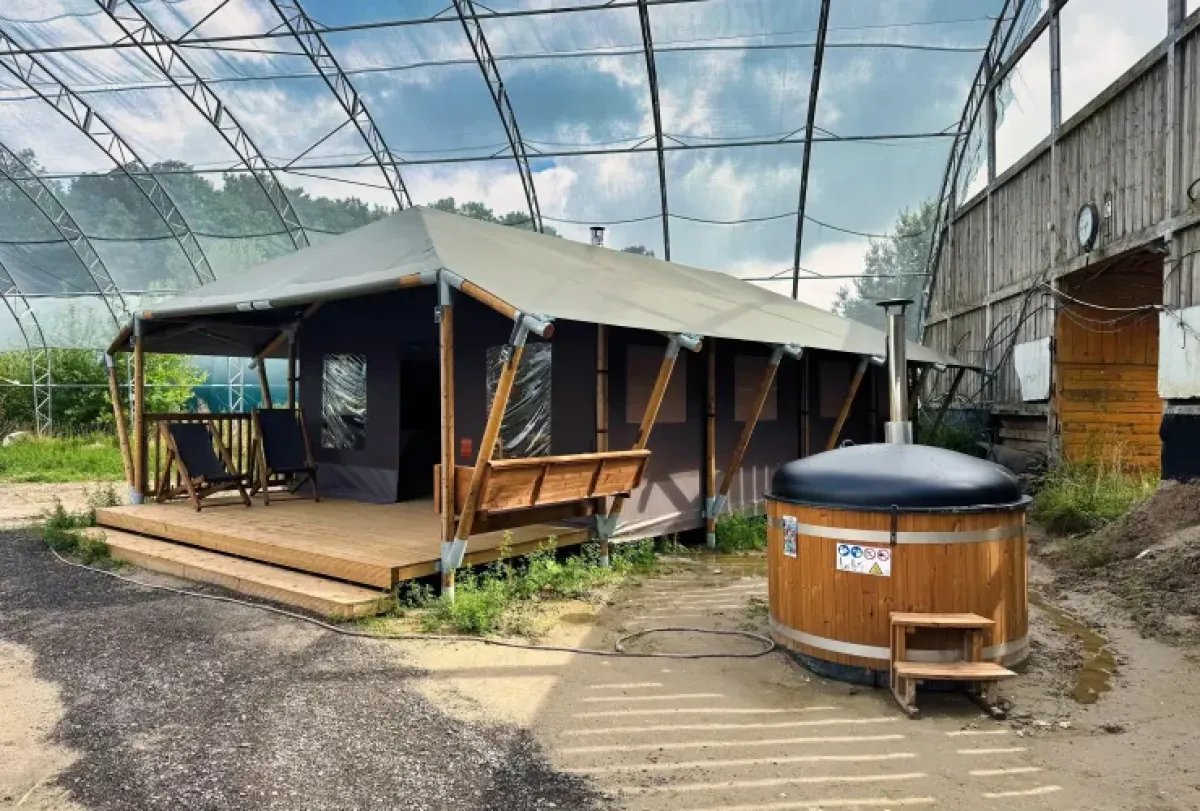 Overkapt Tenthuisje met warme privédouche naast de tent met Hottub